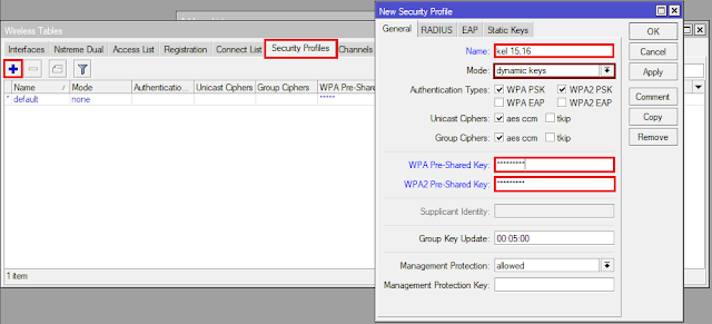 3. . Lalu kita harus membuat keamanan yang berupa password, caranya : masih di menu yang sama yaitu Wireless kemudian klik security profiles lalu klik simbol + maka akan keluar tab security profiles. untuk nama dan password terserah kalian. kalau sudah klik apply kemudian OK